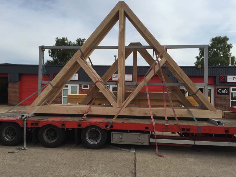 Delivery of timber frame components is transport provided by Ipswich Timber Frame’s. Each vehicle is equipped with an electronic crane. To ensure that our chain of service is completed from the design/manufacturing stage through to arrival on site on time, for our dedicated highly skilled erecting team to commence installation of the timber frame components.